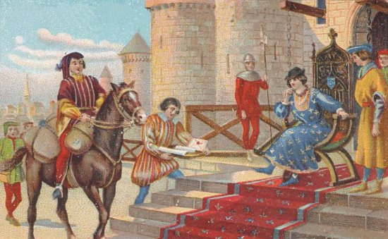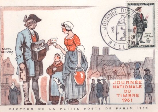 La Poste est issue des relais de poste créés par le Roi Louis XI en 1477 pour le transport des messages royaux et des offices de messagers royaux créés en 1576 qui sont autorisés à transporter le courrier des particuliers ♦ confer le dessin 2 ci-contre.