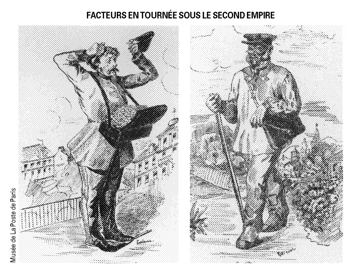 [5]Les messagers-piétons depuis 1796, , distribuaient 2 à 3 fois par semaine le courrier officiel entre l’Etat, les préfets et les maires, élargissant parfois leurs prestations aux particuliers aisés.