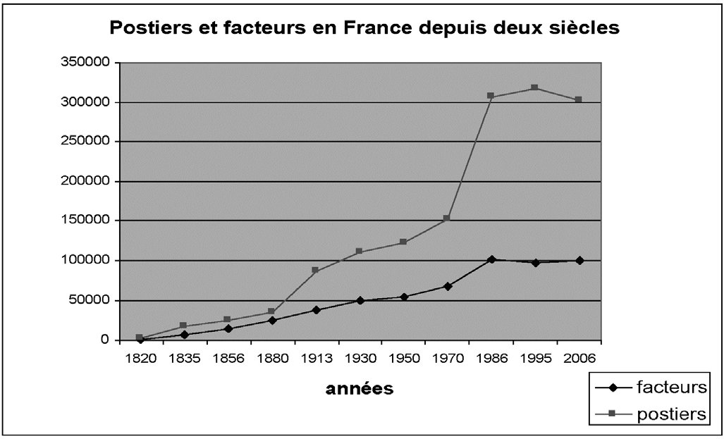 Partant de près de 3 500 employés en 1820, l’entité postale a franchi la barre symbolique des 100 000 à la fin des années 1920 pour atteindre son maximum en 2001 avec 325 000 postiers, avant de redescendre aux alentours de 300 000 en 2006. Au sein des postiers, les facteurs constituent une catégorie de grande importance qui a constitué durant deux siècles entre 26% et 70% de l’ensemble des postiers. Ainsi, l’étude parallèle de l’évolution des effectifs, celui de postiers et celui des facteurs, permet-elle, à partir de ces deux courbes, d’éclairer les grandes évolutions structurelles d’une entité progressivement passée d’une activité courrier ultra-majoritaire à une diversification assumée ♦ confer le graphique 14 ci-contre.